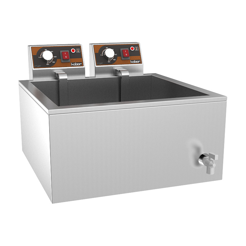 Чебуречница Кобор FC2-13 настольная с электрическим нагревом масла. Корпус из нержавеющей стали. Кран для слива масла. Температурный режим от 0 до 180°С. Объем 27 л. Размер корзины, мм:418х400х180.