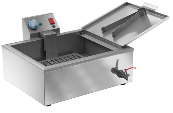 Фритюрная ванна состоит из корпуса ванны и самой ванны. Оба элемента выполнены из пищевой нержавеющей стали. Ванна имеет кран для слива отработанного фритюра.