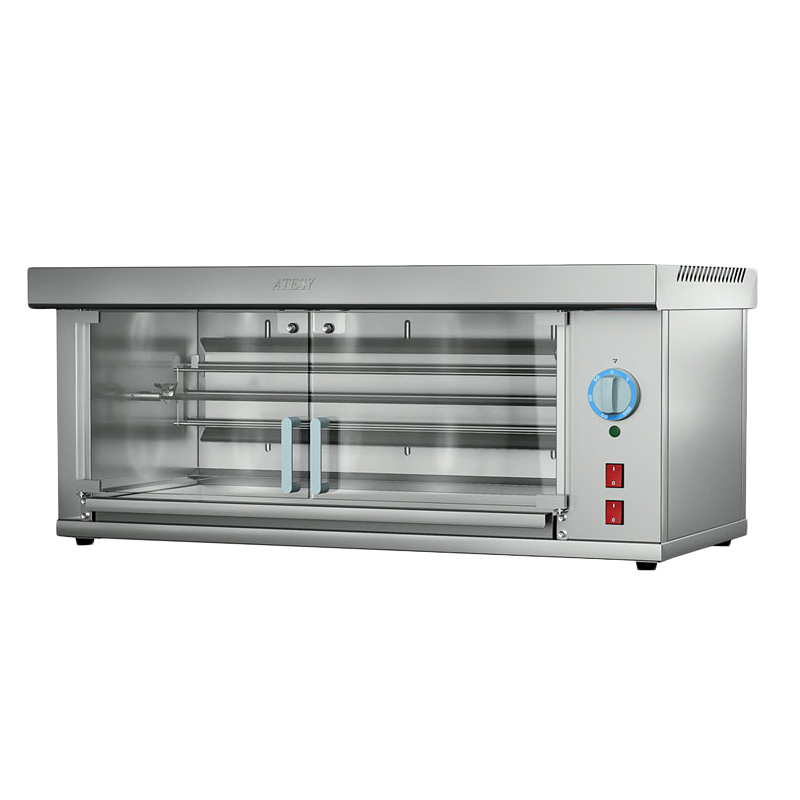 Гриль для кур ATESY (Атеси) Командор-2/1М используется на предприятиях общественного питания и торговли. Модель оснащена электродвигателем, раздельными терморегуляторами для каждой группы ТЭНов, съемным шампуром, внутренней подсветкой камеры и поддоном для сбора жира. Корпус и все внутренние элементы выполнены из пищевой нержавеющей стали, дверца - из термостойкого ударопрочного стекла с добавлением горного хрусталя, ручка двери - из термостойкого пластика, и ножки - из пластмассы.