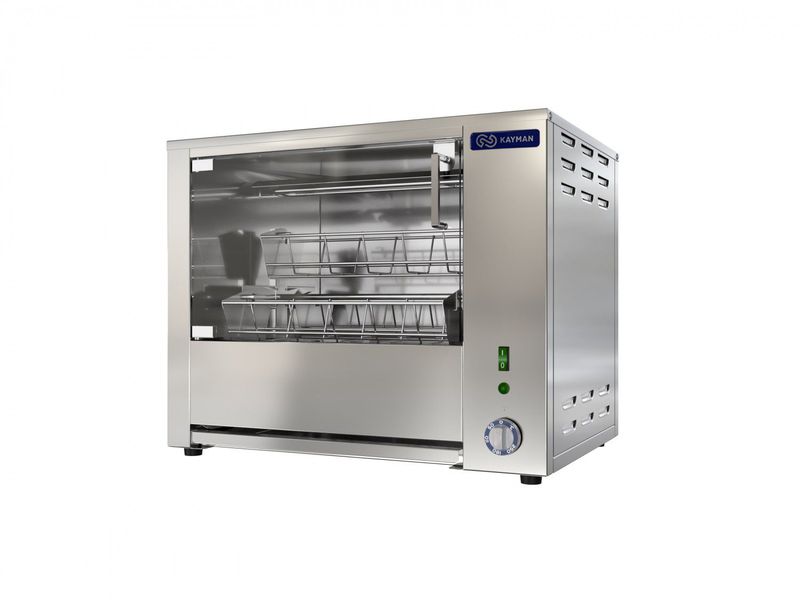 Гриль для кур KAYMAN ГЭ-4C8 A используется на предприятиях общественного питания и торговли. Модель оснащена электродвигателем, терморегулятором, ТЭНами с отражателями тепла, съемными садками, внутренней подсветкой камеры и поддоном для сбора жира. Корпус и все внутренние элементы выполнены из пищевой нержавеющей стали, дверцы - из термостойкого ударопрочного стекла с добавлением горного хрусталя, ручки дверей - из термостойкого пластика, и ножки - из пластмассы.