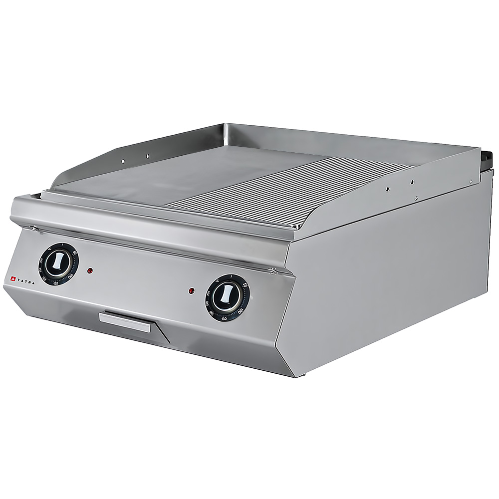 Жарочная поверхность Tatra TET.89SR предназначена для жарки мяса, птицы, рыбы, овощей и быстрого разогрева полуфабрикатов на предприятиях общественного питания и торговли. Модель оснащена комбинированной жарочной поверхностью с двумя зонами нагрева (1/2 гладкая+1/2 рифленая) с независимой регулировкой, электромеханической панелью управления с термостатом, регулируемыми ножками и съемной емкостью для сбора жира. Корпус выполнен из нержавеющей стали.