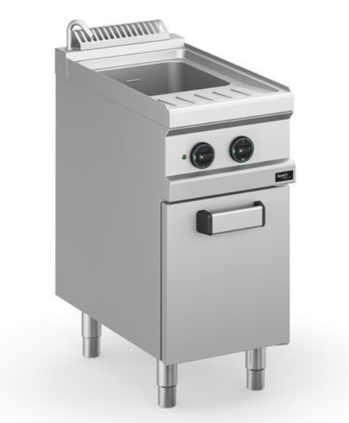 Макароноварка Apach APPE-47P/PL 700-й серии используется на предприятиях общественного питания и торговли для приготовления спагетти, пасты и прочих изделий из теста. Модель оснащена закрытым шкафом с распашной дверцей и электромеханической панелью управления с терморегулятором, таймером и световым индикатором. Корпус, рабочая поверхность, панель управления и вытяжная решетка выполнены из нержавеющей стали AISI 304, дверца, боковые и задние панели - из нержавеющей стали AISI 430, ванна - из нержавеющей стали AISI 316, нагревательные элементы - из нержавеющей стали.