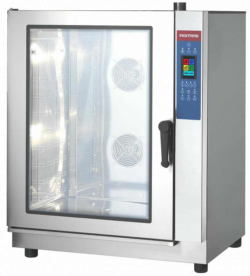 Пароконвектомат Inoxtrend PDT010E с сенсорным управлением способен заменить несколько типов теплового оборудования и значительно ускорять процесс приготовления блюд в кафе, столовых и отделах кулинарии в супермаркетах. Корпус, камера и направляющие выполнены из нержавеющей стали.