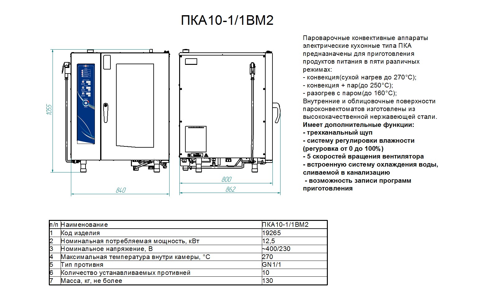 Пароконвектомат ПКА 10-1/1 ВМ2 инжекционного типа предназначен для приготовления различных блюд методом обработки паром и горячим воздухом по отдельности или комбинированно. Способ образования пара - инжекционный впрыск влаги в камеру. Модель сочетает в себе надежность и производительность предыдущих предыдущих, а также ряд новых технических решений, которые делают его использование еще более удобным и легким. При одновременном приготовлении различных блюд каждое из них сохраняет свой вкус и аромат, большинство витаминов и минеральных веществ, выглядит аппетитным и свежим.