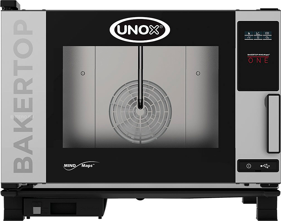 Печь конвекционная UNOX XEBC-04EU-E1RM серии BAKERTOP MIND.Maps™ ONE предназначена для выпечки хлебобулочных и кондитерских изделий на предприятиях общественного питания и торговли, в пекарнях и кондитерских. Модель оснащена электронным управлением и встроенной в дверь светодиодной подсветкой. Легко открывающееся внутреннее стекло облегчают чистку и обеспечивает максимальную гигиену. Камера с закругленными углами выполнена из нержавеющей стали AISI 304, направляющие - из профилированной стали, дверной замок - из высокопрочного самосмазывающегося технополимера, внутренний штифт дверной ручки - из углеродного волокна.