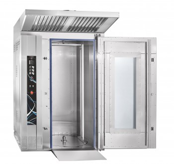 - совершенная аэродинамика обеспечивает равномерную температуру по всей рабочей камере и совместно с вращением тележки позволяет достичь равномерной окраски выпечки на всех уровнях тележки-шпильки;